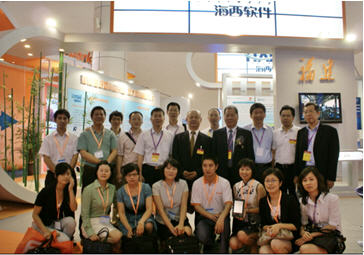 我省由福建省省长助理郑松岩带领我省软件企业参展的“福建省海西软件展区”,受到与会各方及有关领导关怀。福建省长助理郑松岩、福建省信息化局副局长邵玉龙与我司黄旭先生及各企业代表在海西软件展区前合影留念。