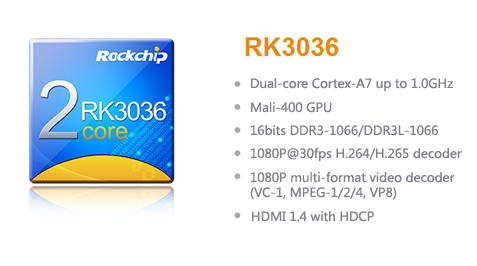 Rockchip RK3036芯片采用双核Cortex-A7架构,主频最高可达1.0GHz;支持1080P H.265/H.264/VC-1/MPEG/VP8Video Decoder;兼容多种协议的流媒体格式;支持多种投屏互动协议,如DLNA、Miracast、WiDi等互联互通协议;