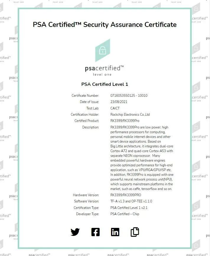 此前,RK3399Pro和RK3399已通过由Arm倡议发起、专为物联网设备构建的安全框架PSA Certified Level 1安全认证,支持基于PSA Certified框架的IoT物联网及边缘计算解决方案高效部署,提升设备的数据安全性及可靠性。