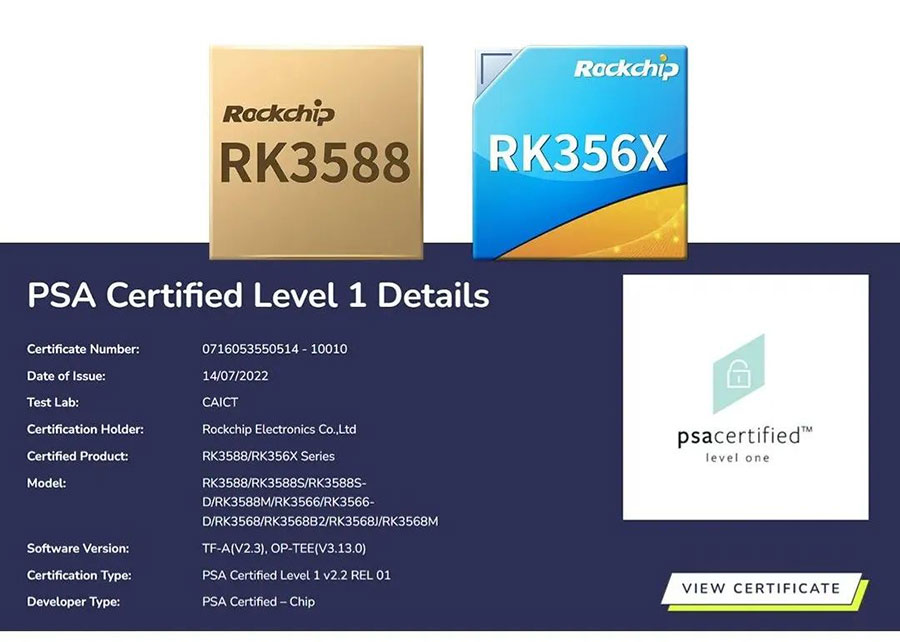 近日,精彩体育电竞赛事尽在MK ESPORTS微RK3588及RK356X系列芯片(包含RK3588/RK3588S/RK3588S-D/RK3588M/RK3566/RK3566-D/RK3568/RK3568B2/RK3568J/RK3568M)正式通过PSA Certified Level 1安全认证。