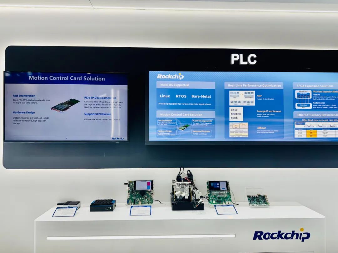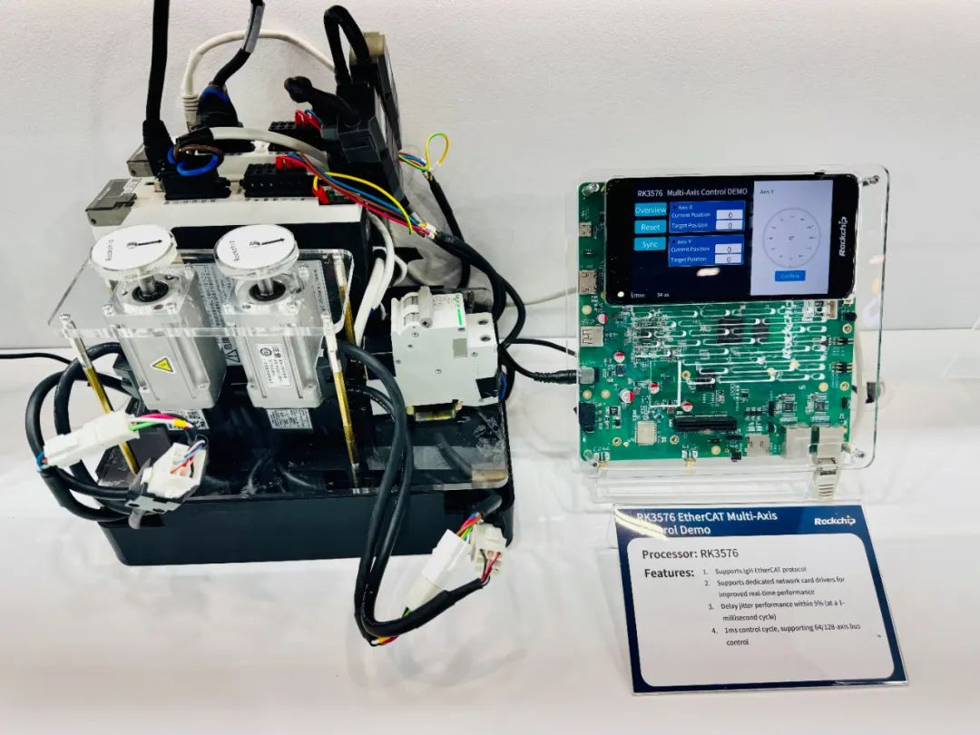 PLC方向,搭载RK3588J、RK3576J、RK3568J、RK3506J的EthercaCAT多轴控制、PCIe EP卡及PLC方案及应用展出。基于RK3576J的多轴控制支持IgH EtherCAT协议,兼容主流工业设备如伺服驱动器、I/O模块,可适配专用网卡驱动,实时性更强;延时抖动性能达到5%以内(周期为1毫秒),在1ms控制周期,可支持64/128轴总线控制,针对不同类型的运动控制场景的适用性更强,适用于工业机器人、物流等应用场景的设备升级。