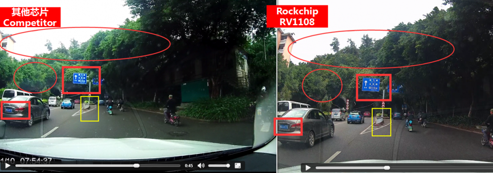 The images in red frame show the significantly difference in the video. Under the strong daylight, the image of competitor on the left obviously reflects the light and disappears the building, while RV1108 well-disposes the image exposure and clearly shows the building, hence highlighting the excellent WDR performance.
