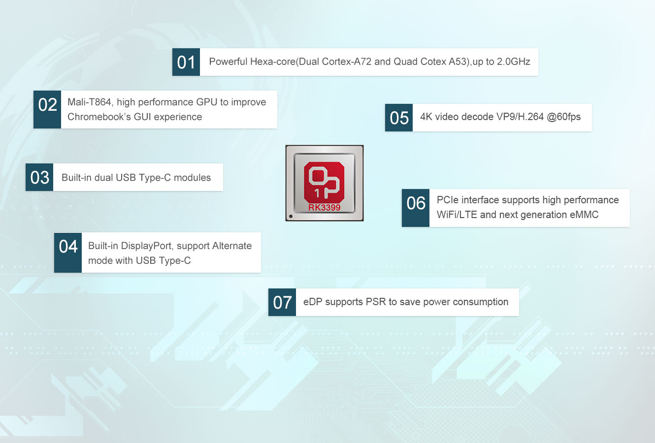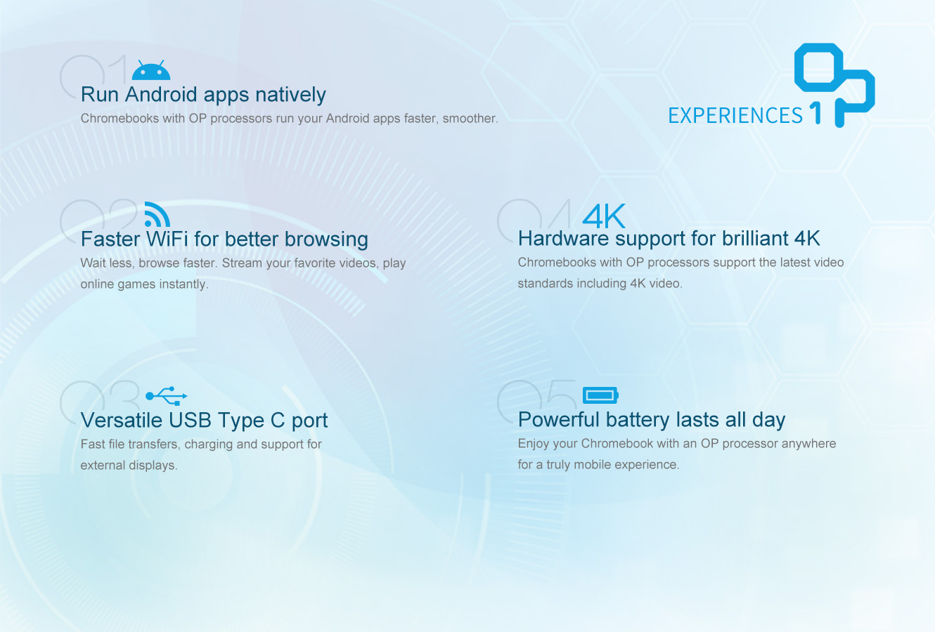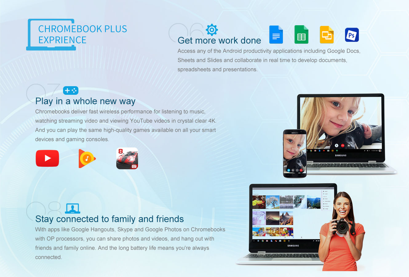 Powered by OP1-RK3399, Chromebook Plus has two USB-C ports for enhanced connectivity and 4k video streaming, producing high quality video and gaming from the Chromebook on connected 4k displays.